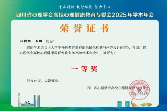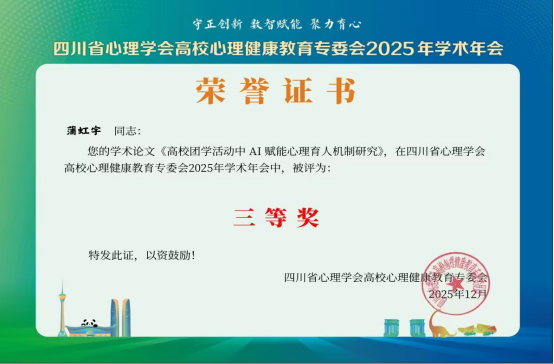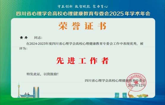 在年会闭幕仪式上,专委会对2024-2025年四川省普通高校心理健康教育先进集体和先进工作者进行了表彰。我校心理健康教育中心教师黄丹凭借在心理育人工作中的突出表现,荣获“先进工作者”表彰。