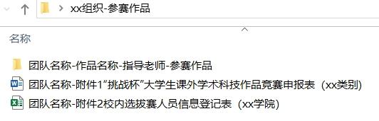 一份参赛作品一个文件夹,文件夹命名方式为:团队名称-作品名称-指导老师-参赛资料包。详情如图所示: