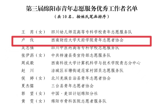 喜报|西南财经大学天府学院在第三届绵阳市青年志愿服务工作评选中荣获佳绩
