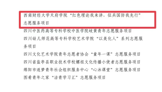 日前,共青团绵阳市委办公室下发的“关于表扬第三届绵阳市青年志愿服务优秀组织、工作者、个人和项目的通报”中,西南财经大学天府学院青年志愿者协会的卢伐老师荣获“绵阳市青年志愿服务优秀工作者”荣誉称号;西南财经大学天府学院“红色理论我来讲,征兵国防我先行”志愿服务项目,荣获“绵阳市青年志愿服务优秀项目”奖项。此次获奖既是对西财天府学院工作的肯定,也是对广大天府师生的激励与鼓舞。