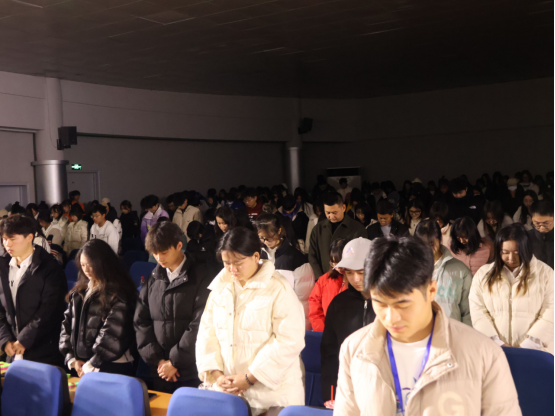 12月13日是第十个南京大屠杀死难者国家公祭日,在晚会开始前,全体师生在会场为南京大屠杀死难者低头默哀。