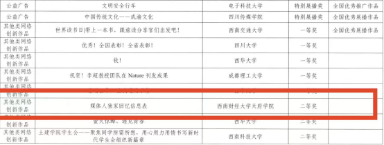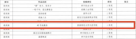 近日,由中央网信办网络社会工作局、教育部思想政治工作司联合举办的第七届“全国大学生网络文化节”和“全国高校网络教育优秀作品推选展示活动”与由中共四川教育工作委员会、中共四川省网络安全和信息化委员会办公室主办的第七届“四川大学生网络文化节”和“四川高校网络教育优秀作品推选展示活动”入选名单正式公布,西南财经大学天府学院荣获一个国家级奖项与五个省级奖项。
