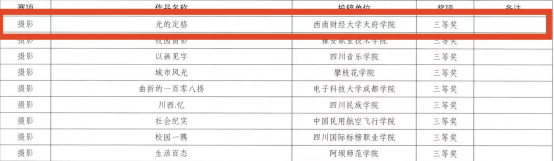 据悉,此次大赛是为引导广大师生积极参与网络文化作品创作,丰富网络文化内容供给,传播正能量,弘扬主旋律,争做校园好网民,进一步提升校园网络文化建设的质量和水平,中共四川省委教育工作委员会、中共四川省委网络安全和信息化委员会办公室组织举办了第七届四川大学生网络文化节和四川高校网络教育优秀作品推选展示活动。西南财经大学天府学院的天府学子们各自发挥自身的创新与艺术才能在此活动中荣获国家级以及省级的佳绩。