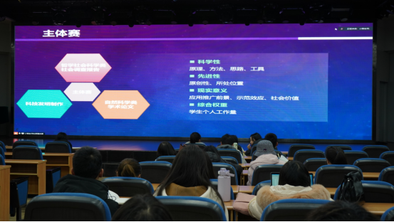随后,王天泽向学子们介绍比赛大致内容与详细事宜。他表示,比赛内容分为赛制规则、竞赛类别、评审要点剖析三个方面。“挑战杯”主要由主体赛和专项赛两个大类组成。主体赛分为科技发明制作、自然科学类学术论文、哲学社会科学类社会调查报告这三种类别。专项赛则分为“红色专项”活动和“黑科技”展示活动这两种类别。紧接着,王天泽又向学子们仔细讲述以上参赛类别的小子类,以及注意事项和得分点。除此之外,王天泽还特别强调科技发明制作类侧重考核作品的科学性、先进性、应用价值和转化前景,而自然科学类学术论文侧重考核基础学科学术探索的前沿性和学术性。讲座现场气氛热烈,天府学子认真聆听,纷纷记下重点知识。