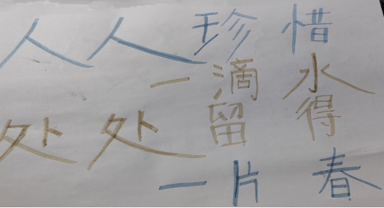 面对水资源紧缺的严峻形势,天府学子将珍惜水资源的意识贯彻落实到日常的学习和生活当中。学子们在学校的引领下参与节水活动,自觉珍惜水资源。在日常生活中,学子们会主动关掉没关紧的水龙头;将洗脸没用完的水拿来浇灌花草;洗手洗碗时也会自觉节约用水。天府学子用实际行动履行着节约用水的承诺。