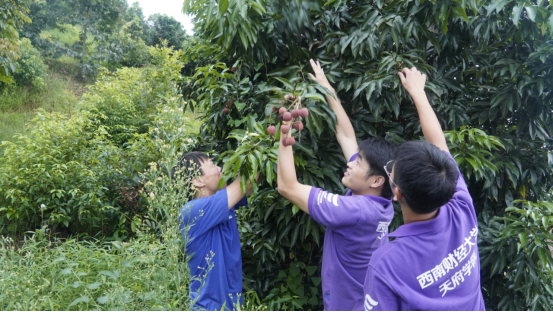 随后,团队紧紧跟随基地负责人进行荔枝采摘,明晰合江荔枝生产销售流程,为荔枝助农直播做准备。穿梭在红绿相映的荔枝林中,队员们轻轻地摘下颗颗硕大饱满的荔枝,感受着丰收的喜悦,满载而归。紧接着,在助农直播中,团队成员化身为热情洋溢的主播,在镜头前各展所长,向广大网友推荐酸甜适宜的合江荔枝,直播间内气氛热烈,互动频繁,成功吸引了大量观众的关注,顺利地将合江荔枝通过助农直播的方式推销给了更多地区的民众。与此同时,团队还积极投身于三块石村委会的志愿服务之中,以队员参与村务处理为主要形式,协助村委会更好地完成村委工作。